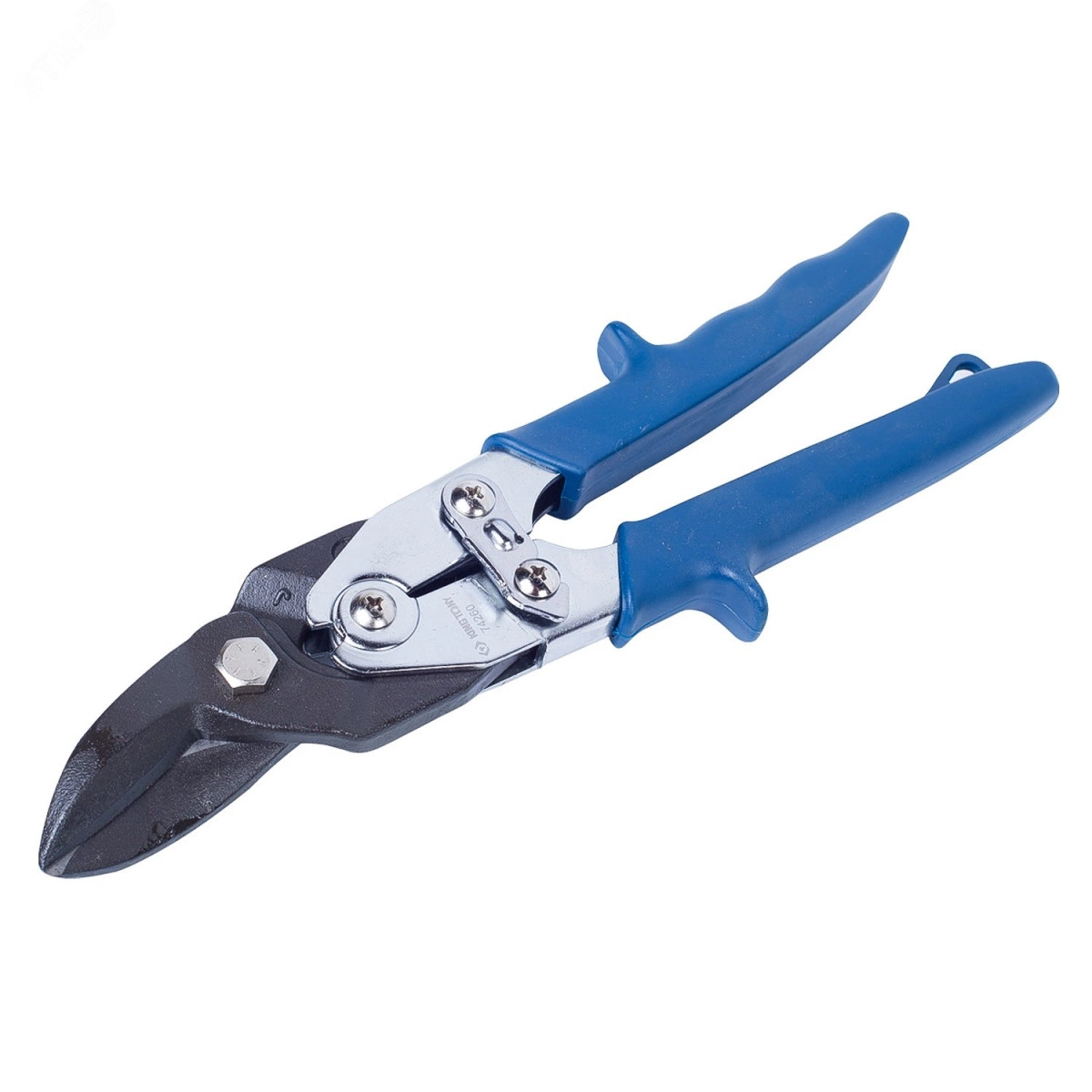 Ножницы по металлу, загнутые. Правый рез. Применяется на станциях технического обслуживания (СТО), автосервисах, автомастерских. Режущие кромки с насечкой предотвращают проскальзывание при резании. Режущие кромки подвержены индуктивной закалке. Конструкция с двумя осями обеспечивает большое усилие резания. Твердость 59-62 HRC. Надежный фиксатор.