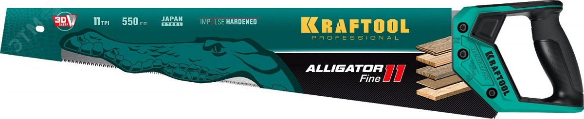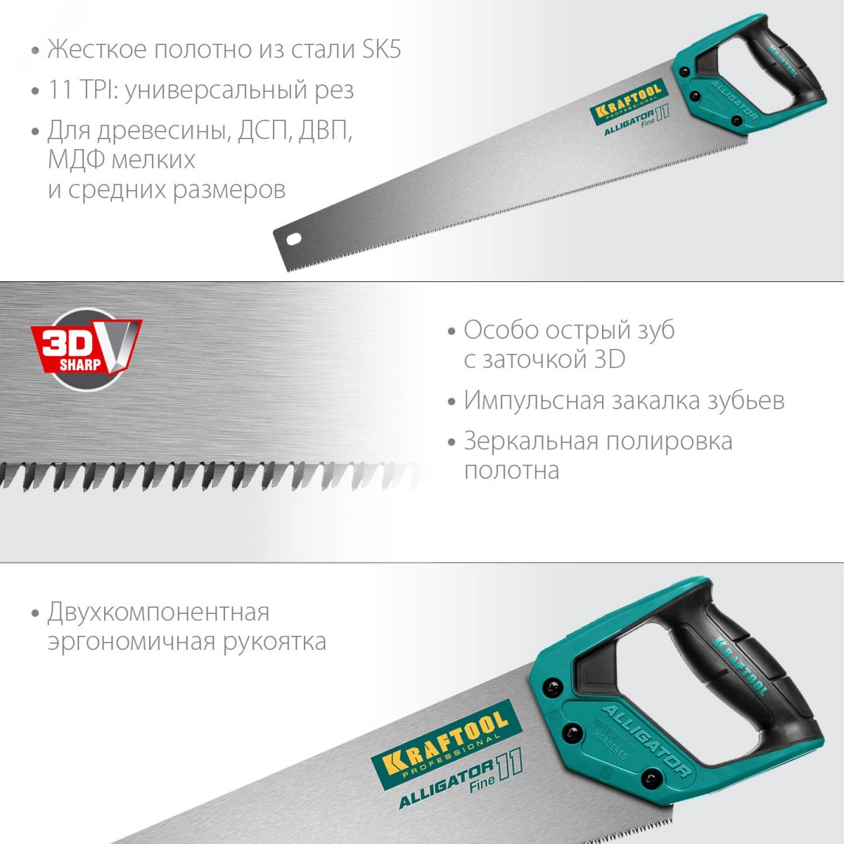 Ножовка для точного реза Alligator Fine 11 KRAFTOOL 15203-55, предназначена для точного и качественного реза ламината, ДСП, ДВП, МДФ. Японская сталь SK-5. Импульсная закалка зубьев. Оснащена высококачественным полотном с прочными и острыми зубьями. Двухкомпонентная ручка специальной конструкции обеспечивает надежный хват инструмента во время работы. Зубья закалены и имеют 3D заточку и остаются острыми даже после интенсивной эксплуатации ножовки.