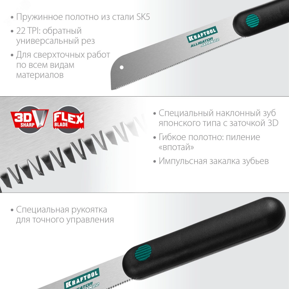 Ножовка по дереву (пила) ''Alligator Japan 22'' имеет закаленные зубья двух типов- универсальные (для продольного и поперечного распила заготовок средних размеров) и с трёхгранной заточкой (3G - RS). Эта модель отлично подходит для сверхточного распиливания фанерных и ДСП заготовок небольших размеров, а также для работ с ламинатом и пластмассой.