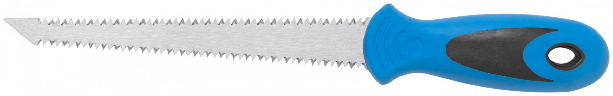 Ножовка по гипсокартону MOS имеет узкое лезвие с зазубренной кромкой и используется для пиления гипсокартонных плит. Заточенное острие обеспечивает легкость протыкания материала перед последующей работой. Ножовка оснащена обрезиненной двухкомпонентной рукояткой, что повышает удобство при работе.