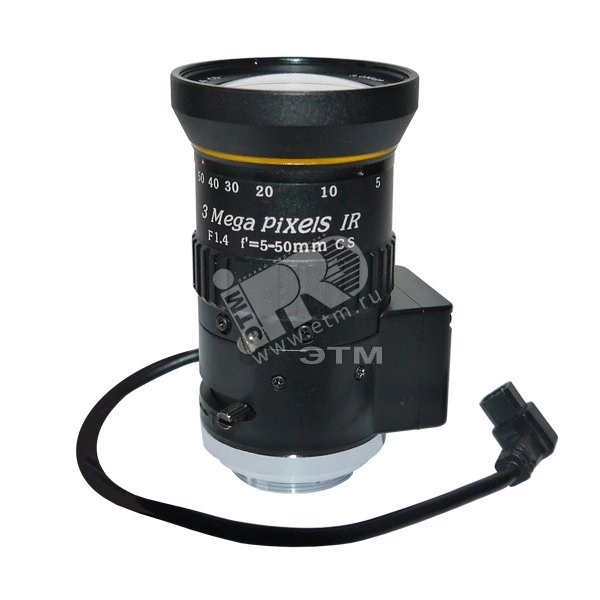 Вариофокальный объектив с фокусным расстоянием 5.0-50 мм для ТВ камер с форматом матрицы 1/2.7? и разрешением 3MP. Управление диафрагмой по постоянному току (Direct Drive) означает, что схема принятия решения о положении диафрагмы находится в видеокамере, а в объективе имеется только мотор, как исполнительное устройство. Объектив оснащен специальным покрытием, компенсирующим разницу в длинах волн видимого и ИК излучения, что дает четкую картинку для камеры днем и ночью. У объектива отличная светопропускная способность по всему полю изображения, а также компактная, легкая и прочная конструкция. Стандартное крепление CS-mount.