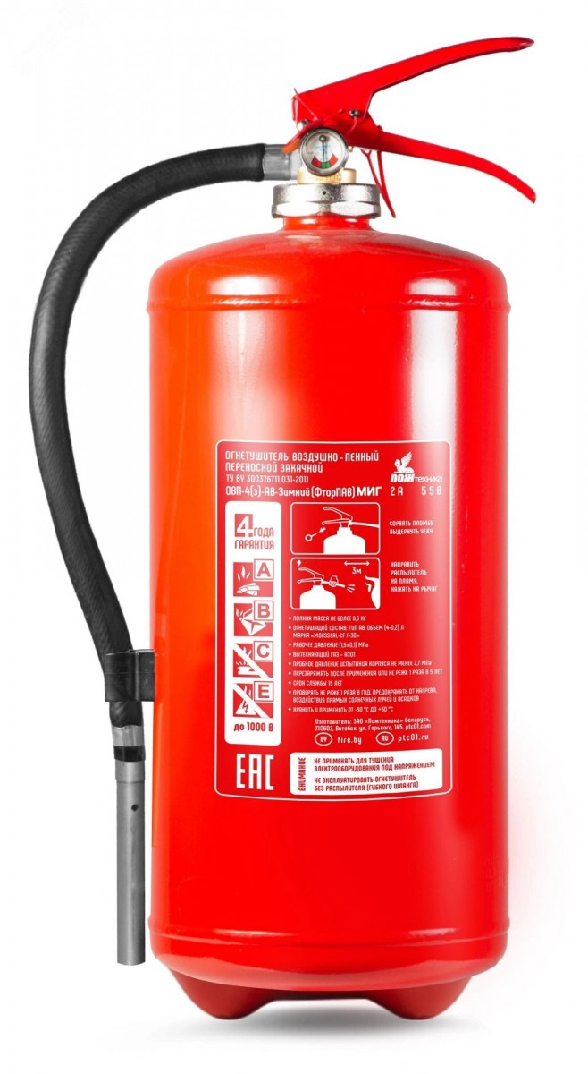 Огнетушитель воздушно-пенный закачной МИГ, предназначен для оснащения органов и подразделений по чрезвычайным ситуациям, защиты объектов народного хозяйства, транспортных средств, а также для применения в бытовых условиях в качестве первичного средства тушения пожаров классов А (твердых тлеющих материалов), В (горючих жидкостей). Огнетушитель не предназначен для тушения загораний щелочных, щелочноземельных металлов и других материалов, горение которых может происходить без доступа воздуха, а также пожаров класса С (горючих газов) и Е (электроустановок, находящихся под напряжением). Расширенный температурный диапазон, готов к эксплуатации при отрицательной температуре.