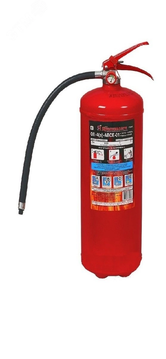 Огнетушители порошковые закачные ОП-4 (з) с массой огнетушащего вещества 4кг предназначены (в зависимости от вида заряженного порошка) для ликвидации пожаров твердых веществ, в основном органического происхождения (класс А), пожаров горючих жидкостей или плавящихся твердых веществ (класс В), пожаров газообразных веществ (класс С), а также пожаров электрооборудования, находящегося под напряжением не более 1000 В (пожар класса Е), при эксплуатации в условиях умеренного климата У, категории 2, тип атмосферы II по ГОСТ 15150. Огнетушители не предназначены для тушения загораний щелочных и щелочноземельных металлов и других материалов, горение которых может происходить без доступа воздуха. Огнетушители являются изделиями многоразового пользования.