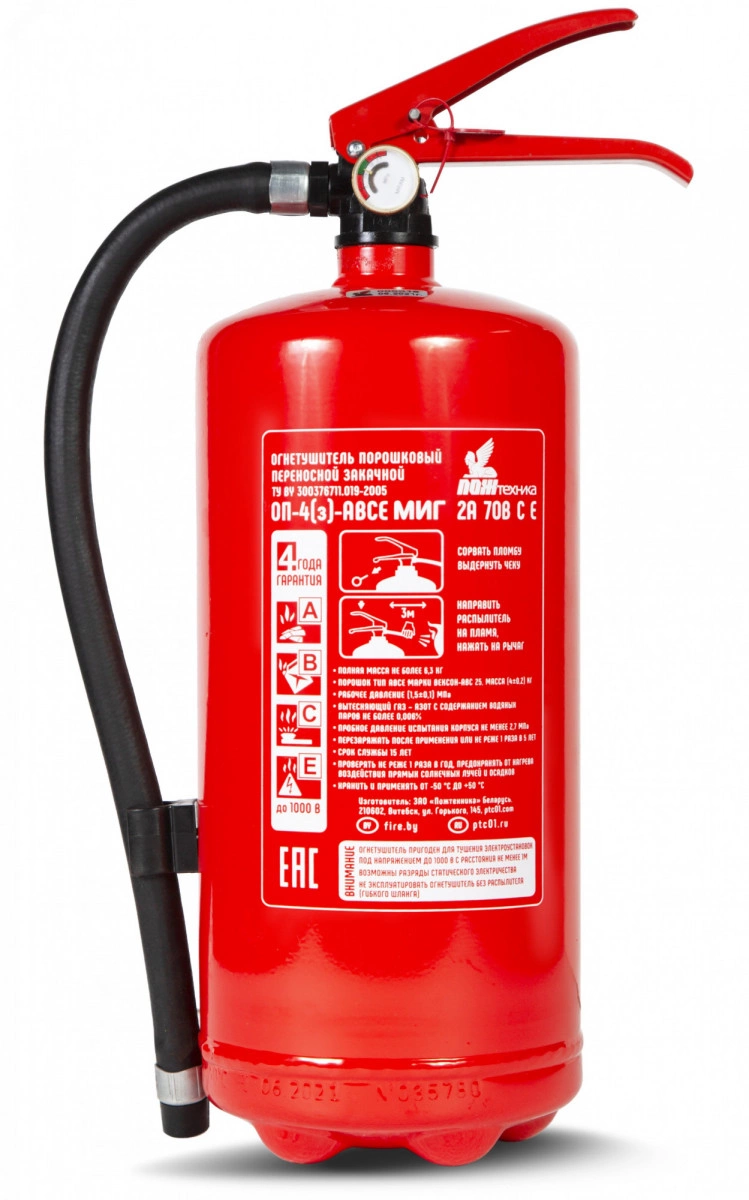 Профессиональный и компактный огнетушитель ОП-4(з) АВСЕ МИГ (2А 70В С Е) с повышенной огнетушащей способностью станет для Вас гарантом безопасности в доме, автомобиле, на даче, в гараже, бане, мастерской. По огнетушащей способности превосходит огнетушитель ОП-4 других производителей (2А 55В С Е). Тушит не менее 9м2 твердых веществ (дерево, бумагу, текстиль, пластик) и 70л горючей жидкости, горючие газы, электрооборудование под напряжением до 1000 В, что подтверждено испытаниями МЧС России и сертификатами соответствия. Срок службы 15 лет (у обычных огнетушителей 10), в течение которых Ваше имущество будет под надежной защитой.