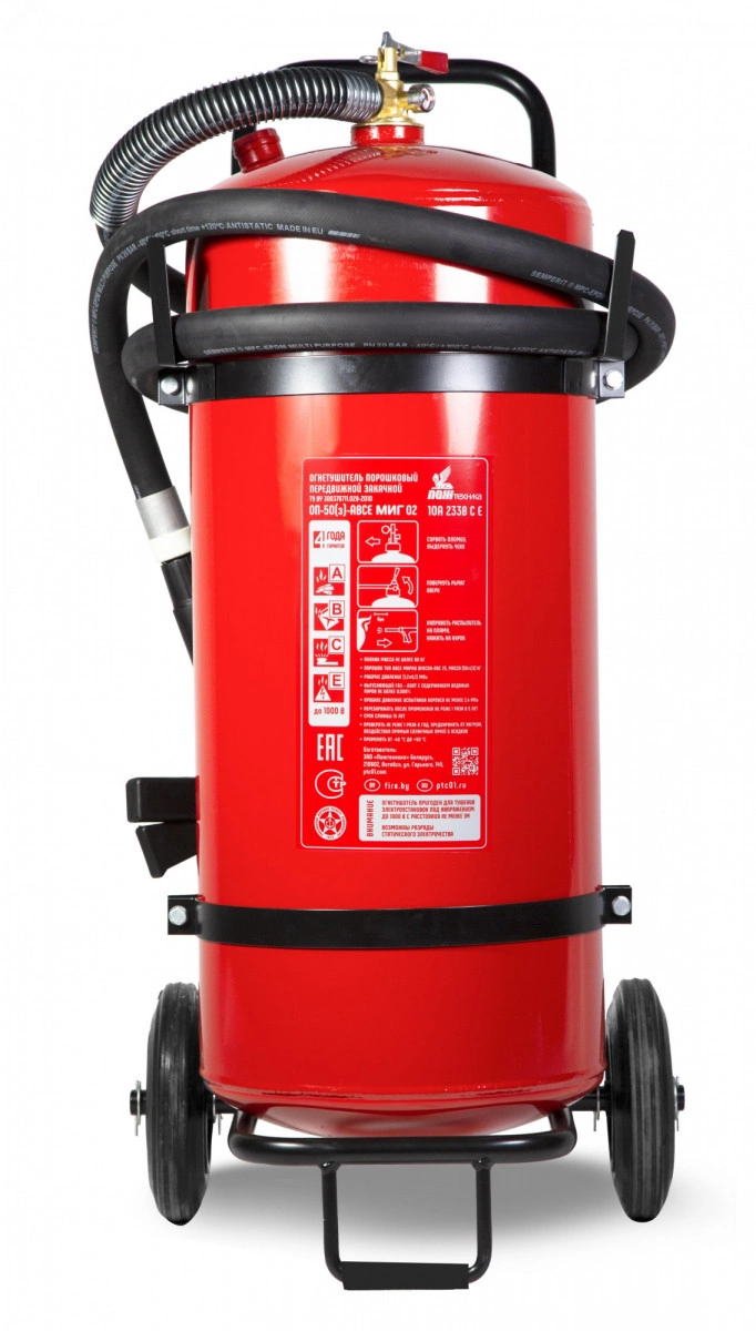 Огнетушитель порошковый передвижной закачной МИГ, распылитель оснащен перекрывным стволом. Предназначен для оснащения органов и подразделений по чрезвычайным ситуациям, защиты объектов народного хозяйства, транспортных средств, а также для применения в бытовых условиях в качестве первичного средства тушения пожаров классов А (твердых тлеющих материалов), В (горючих жидкостей), С (горючих газов) и Е (электроустановок, находящихся под напряжением до 1000 В. Огнетушитель не предназначен для тушения загораний щелочных, щелочноземельных металлов и других материалов, горение которых может происходить без доступа воздуха.