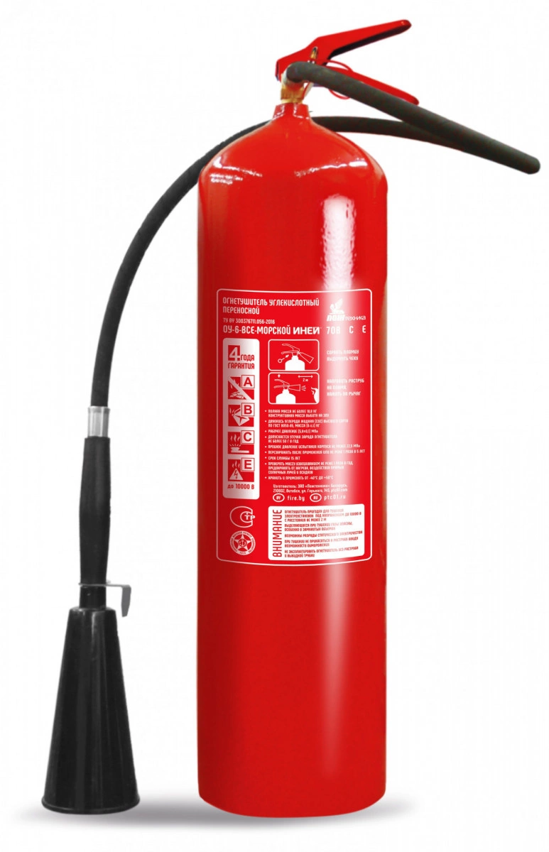 Огнетушитель углекислотный ОУ-6 ИНЕЙ. Предназначен для оснащения органов и подразделений по чрезвычайным ситуациям, защиты объектов народного хозяйства, транспортных средств, а также для применения в бытовых условиях в качестве первичного средства тушения пожаров классов В (жидких веществ), С (газообразных веществ) и Е (электрооборудования, находящегося под напряжением до 10 000 В). Огнетушитель не предназначен для тушения загораний щелочных, щелочноземельных металлов и других материалов, горение которых может происходить без доступа воздуха. Имеет одобрение Морского регистра.
