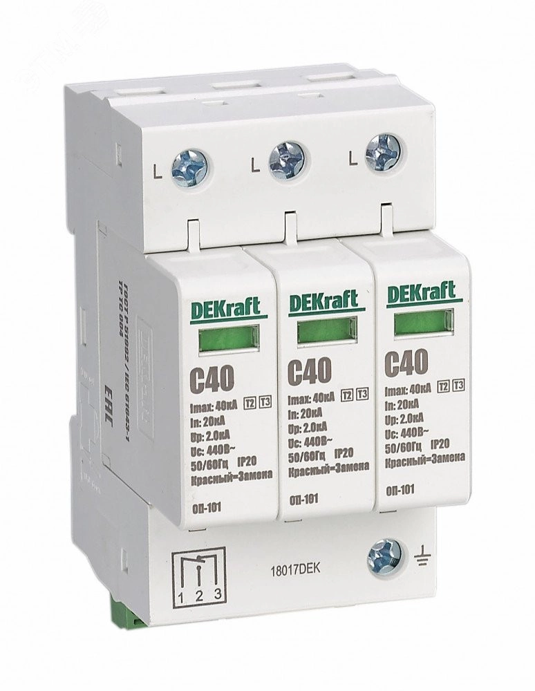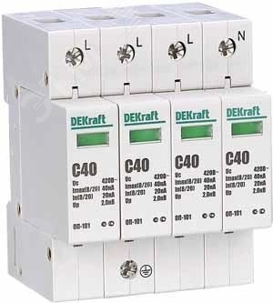 Ограничитель перенапряжения серии ОП-101 DEKraft , 4P, макс.разрядный ток 40 кА, мак.рабочее напряжение 440 В, класс 2(C), монтаж - на DIN-рейку, ширина - 4 мод. х 18 мм. Ограничители срабатывают за миллиардную долю секунды и надежно защищают оборудование от бросков напряжения. Повышенный уровень защиты позволяет ограничить перенапряжения до 2 кВ. Ограничитель оснащен сигнальным контактом. Применяются во ВРУ, ГРЩ, распределительных щитках, коробках и непосредственно возле аппаратов.