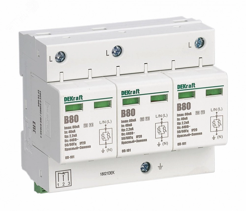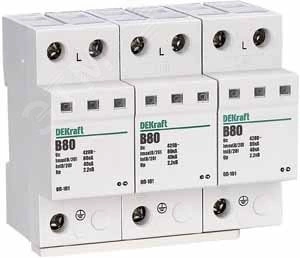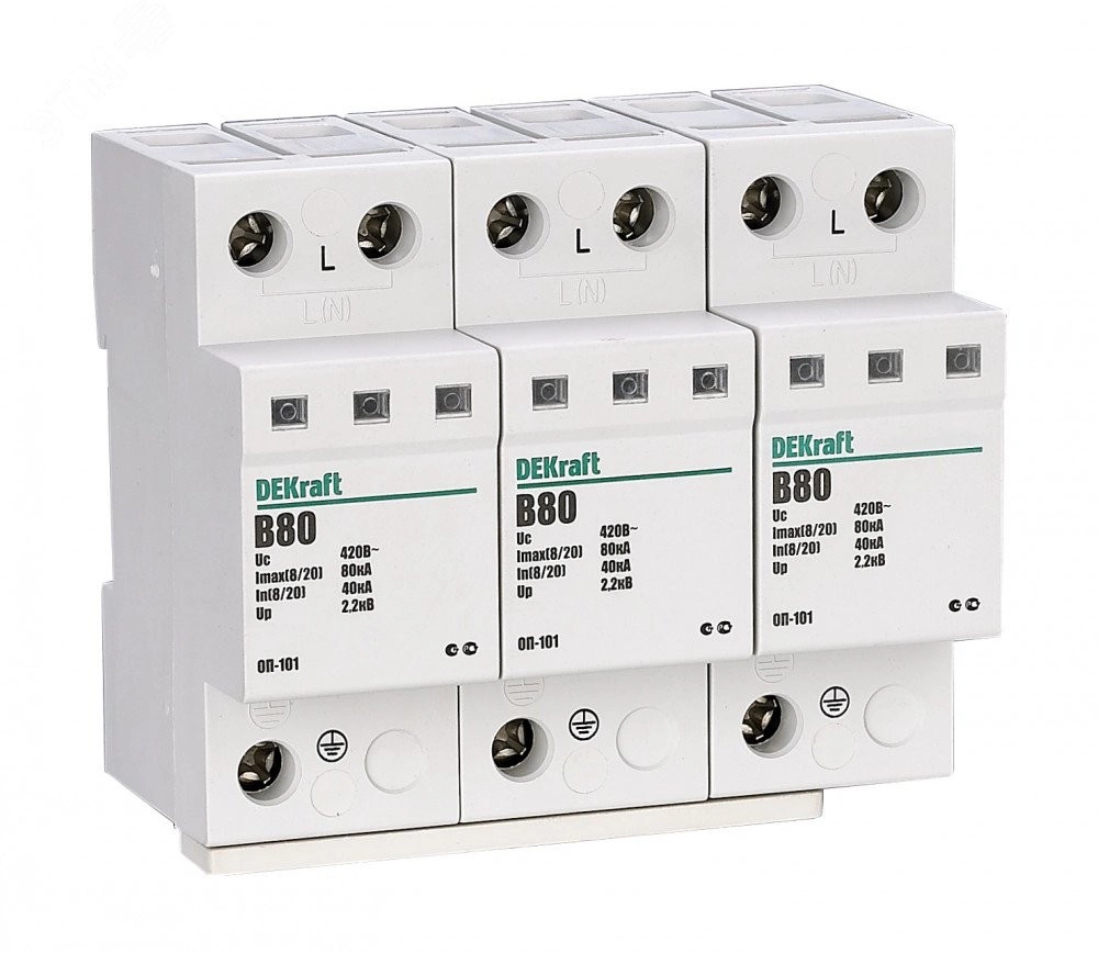 Ограничитель перенапряжения серии ОП-101 DEKraft , 3P, макс.разрядный ток 80 кА, мак.рабочее напряжение 440 В, класс 1(B), монтаж - на DIN-рейку, ширина - 3 мод. х 18 мм. Ограничители срабатывают за миллиардную долю секунды и надежно защищают оборудование от бросков напряжения. Повышенный уровень защиты позволяет ограничить перенапряжения до 2,2 кВ. Ограничитель оснащен сигнальным контактом. Применяются во ВРУ, ГРЩ, распределительных щитках, коробках и непосредственно возле аппаратов.