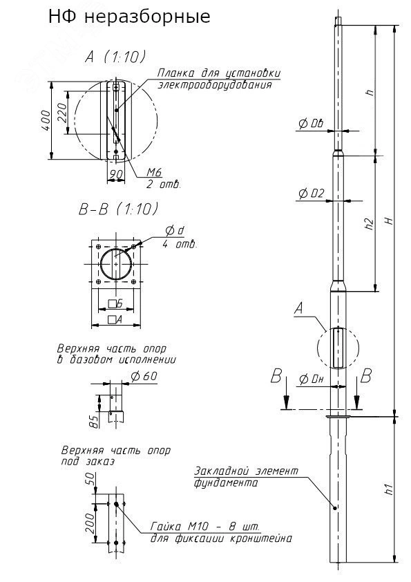 Не допускается использование в качестве силовых. Для распределения кабелей предусмотрен ревизионный лючок с планками для установки комплектующих и точка заземления (болт М10). Подвод питающих кабелей через ревизионные окна закладного элемента. Установка на трубный закладной элемент – ЗДФ (может быть заменён на анкерный – АЗДФ), забетонированный в фундаменте. Закладные элементы необходимо заказывать отдельно. Расчёт параметров фундамента производится исходя из климатических условий, ветрового района и параметров грунта. Для расчёта необходима услуга проектной организации. Комплект поставки - опора, болты М10 с контргайками (зависит от модификации), комплект болтов с гайками и шайбами для крепления к ЗДФ. Опоры высотой более 12 м поставляются в разобранном виде. Сборка осуществляется на месте установки.