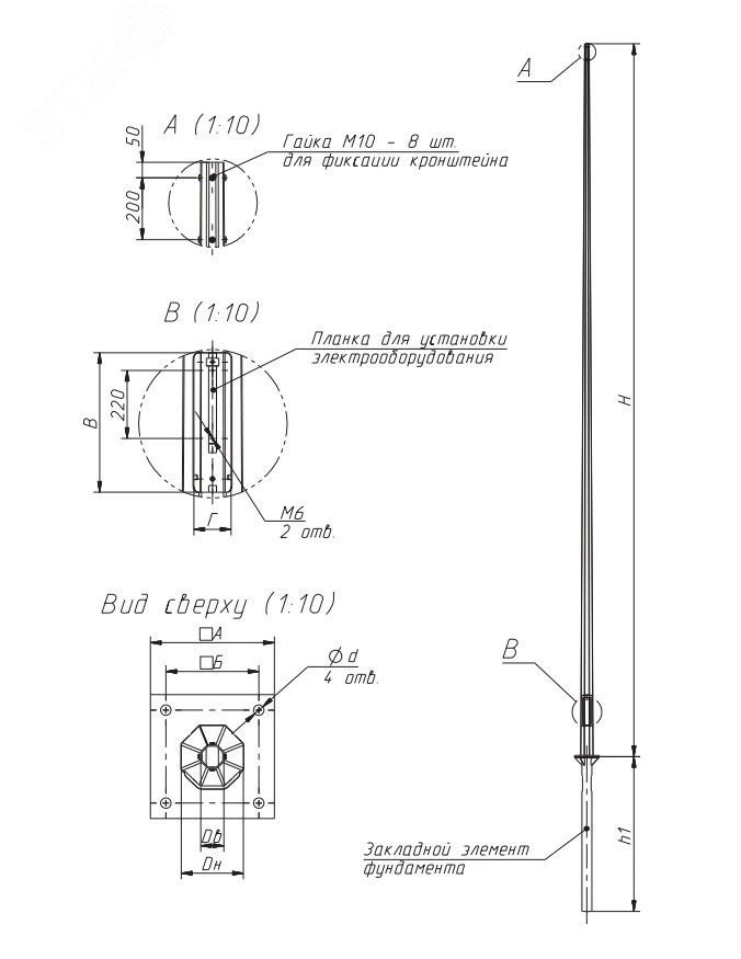 Не допускается использование в качестве силовых. Для распределения кабелей предусмотрен ревизионный лючок с планками для установки комплектующих и точка заземления (болт М10). Подвод питающих кабелей через ревизионные окна закладного элемента. Установка на трубный закладной элемент – ЗДФ (может быть заменён на анкерный – АЗДФ), забетонированный в фундаменте. Закладные элементы необходимо заказывать отдельно. Расчёт параметров фундамента производится исходя из климатических условий, ветрового района и параметров грунта. Для расчёта необходима услуга проектной организации. Комплект поставки - опора, болты М10 с контргайками 6 или 8 шт. (зависит от модификации), комплект болтов с гайками и шайбами для крепления к ЗДФ.