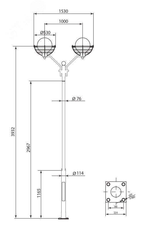 Опоры предназначены для освещения парков, скверов, архитектурных и спортивных объектов, памятников, фасадов зданий. На опору устанавливаются торшерные светильники с диаметром посадочного крепления 60 мм. Установка с помощью болтов или шпилек на железобетонные фундаменты с закладным элементом. Закладные элементы необходимо заказывать отдельно. Расчёт параметров фундамента производится исходя из климатических условий, ветрового района и параметров грунта. Для расчёта необходима услуга проектной организации.