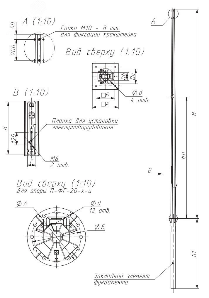Не допускается использование в качестве силовых. Складная конструкция позволяет производить их обслуживание без применения специальной техники. Опора состоит из стационарной и поворотной частей. Поворотная часть опускается до уровня земли ручным способом (с помощью каната, усилие на канате не превышает 30 кг) или с помощью лебёдки (устанавливается на опоры высотой от 10 м). Эксплуатационный комплект заказывается отдельно. Подвод питающих кабелей через ревизионные окна закладного элемента. Закладные элементы необходимо заказывать отдельно. Для опор высотой от 8 метров включительно кронштейн изготавливается совместно с опорой по индивидуальному заказу. Расчёт параметров фундамента производится исходя из климатических условий, ветрового района и параметров грунта. Для расчёта необходима услуга проектной организации. Комплект поставки - опора, болты М10 с контргайками 6 или 8 шт. (зависит от модификации), комплект болтов с гайками и шайбами для крепления к ЗДФ.