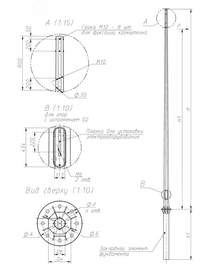 Для подвеса СИП (самонесущий изолированный провод). Предусмотрено отверстие для воздушного подвода питания, точка заземления выполняется на расстоянии 900–1000 мм ниже верхнего обреза опоры. Арматура для СИП поставляется отдельно. В лючке предусмотрена планка для установки комплектующих и точка заземления (болт М10). Возможен подвод кабелей через окно в подземной части ЗДФ. Установка на трубный закладной элемент – ЗДФ (может быть заменён на анкерный – АЗДФ), забетонированный в фундаменте. Закладные элементы необходимо заказывать отдельно. Расчёт параметров фундамента производится исходя из климатических условий, ветрового района и параметров грунта. Для расчёта необходима услуга проектной организации. Комплект поставки - опора, болты М10/М12 (зависит от модификации) с контргайками 8 шт, комплект болтов с гайками и шайбами для крепления к ЗДФ.