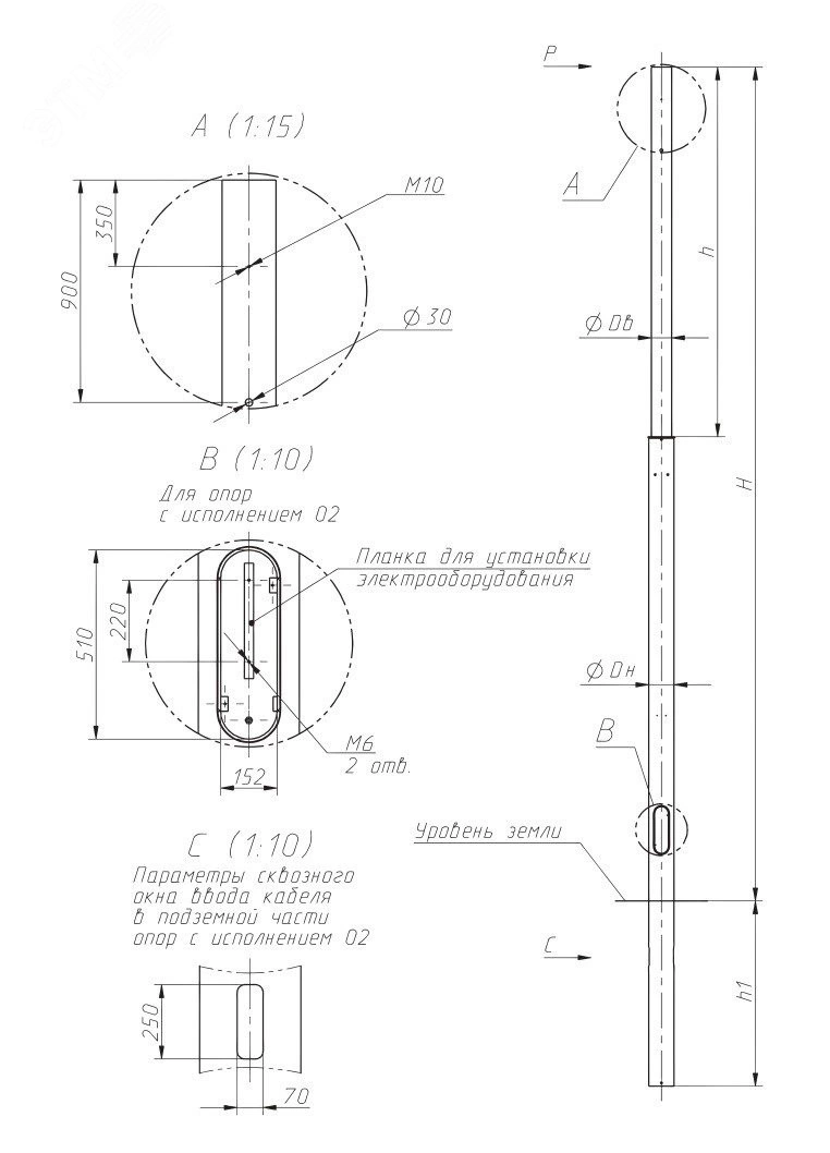 Для подвеса СИП (самонесущий изолированный провод). Предусмотрено отверстие для воздушного подвода питания, точка заземления выполняется на расстоянии 900–1 000 мм ниже верхнего обреза опоры. Арматура для СИП поставляется отдельно. Возможна установка кронштейнов с большим количеством светильников, а также рекламных и иных конструкций.В лючке предусмотрена планка для установки комплектующих и точка заземления (болт М10). Возможен подвод кабелей через окно в подземной части опоры. Установка осуществляется в подготовленный котлован. После установки опор по уровню их подземная часть заливается бетоном. Требуемая прочность обеспечивается при заливке бетоном до уровня, расположенного выше верхнего края окна ввода кабеля на размер D1. Расчёт параметров фундамента производится исходя из климатических условий, ветрового района и параметров грунта. Для расчёта необходима услуга проектной организации. Комплект поставки - опора, болты М10/М12 (зависит от модификации) с контргайками 8 шт.