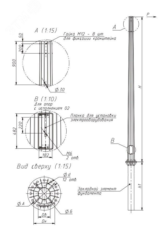 Для прокладки контактных линий и подвеса СИП. Предусмотрено отверстие для воздушного подвода питания, точка заземления выполняется на расстоянии 900–1000 мм ниже верхнего обреза опоры. Арматура для крепления кабеля контактных линий и СИП поставляется отдельно. В лючке предусмотрена планка для установки комплектующих и точка заземления (болт М10). Возможен подвод кабелей через окно в подземной части ЗДФ. Установка на трубный закладной элемент – ЗДФ (может быть заменён на анкерный – АЗДФ), забетонированный в фундаменте. Закладные элементы необходимо заказывать отдельно. Расчёт параметров фундамента производится исходя из климатических условий, ветрового района и параметров грунта. Для расчёта необходима услуга проектной организации. Комплект поставки - опора, болты М10/М12 (зависит от модификации) с контргайками 8 шт, комплект болтов с гайками и шайбами для крепления к ЗДФ.