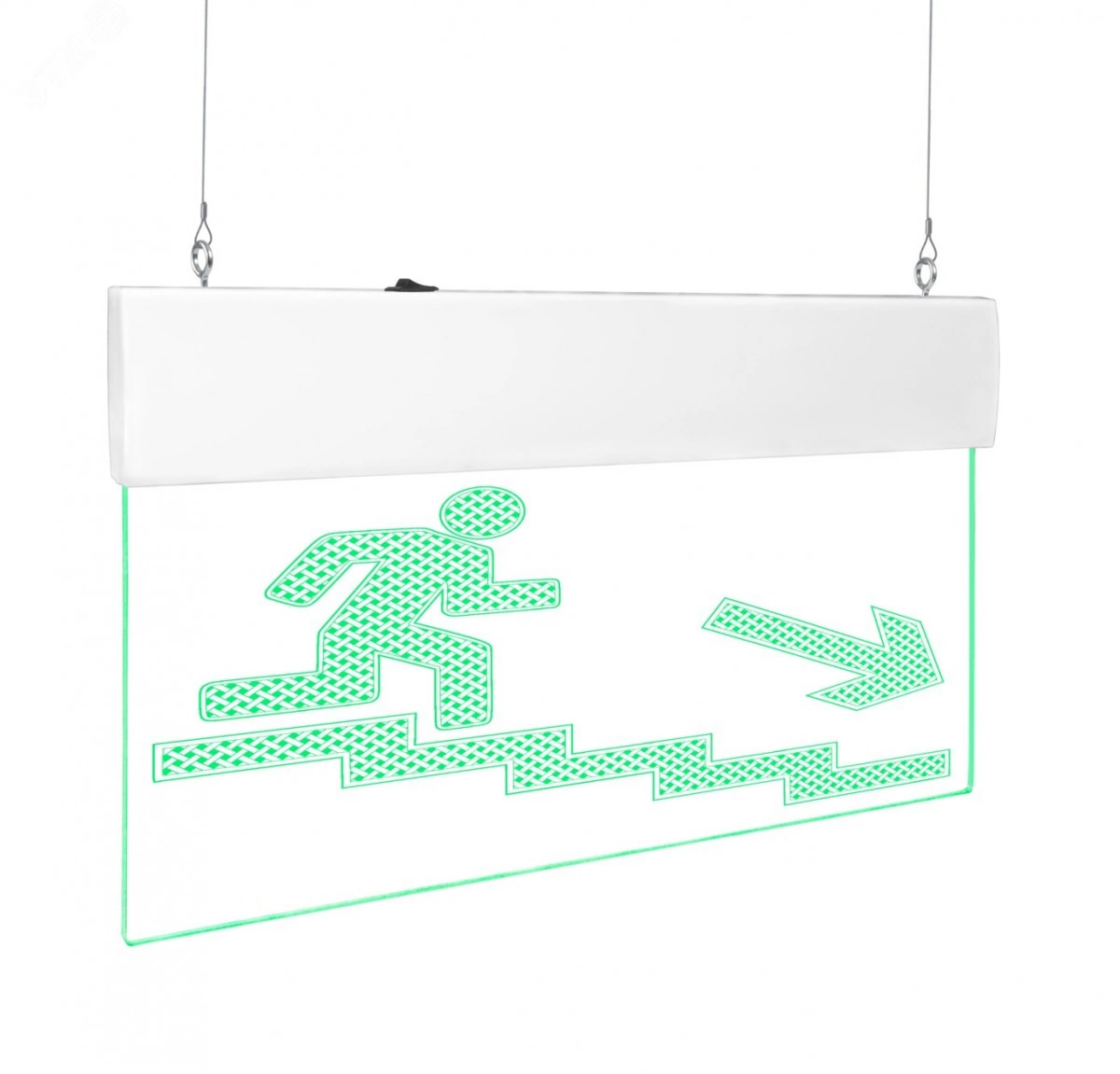 Оповещатель световой с резервным источником питания Молния-220-РИП Ультра Человек по лестнице вправо вниз зеленые светодиоды. ПОДВЕСНОЕ КРЕПЛЕНИЕ