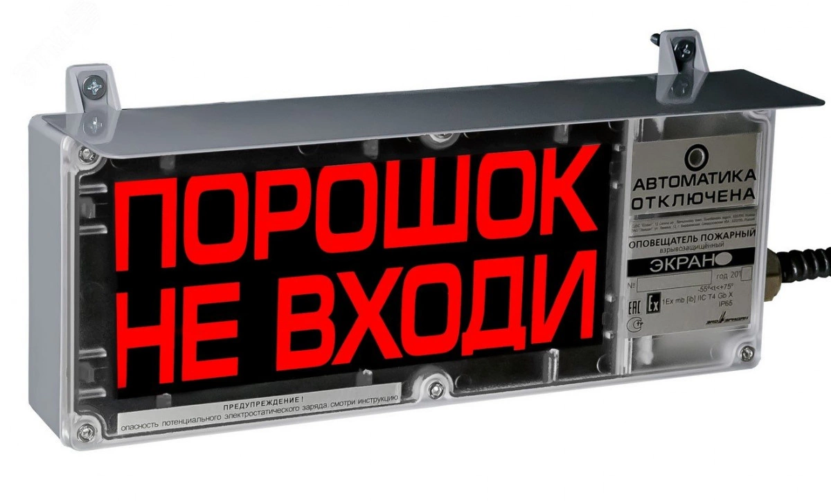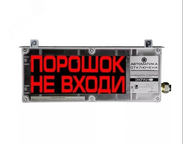 Оповещатель ЭКРАН-СЗ предназначен для использования в качестве светозвукового средства оповещения, и обеспечивает подачу светового и (или) звукового сигналов в системах пожарной и охранной сигнализации, при совместной работе с любыми ПКУ. Оповещатель может использоваться для индикации режимов работы оборудования и привлечения внимания персонала в аварийных и иных ситуациях. Оповещатель взрывозащищенный ЭКРАН-С-К1-оповещатель с постоянно присоединенным кабелем в металлорукаве (по умолч),К1 - оповещатель без дополнительной секции.Текст надписи или содержание пиктограммы основной световой секции - по заказу.