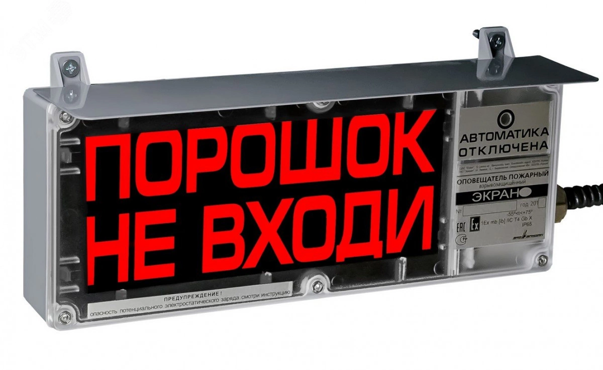 Оповещатель ЭКРАН-СЗ предназначен для использования в качестве светозвукового средства оповещения, и обеспечивает подачу светового и (или) звукового сигналов в системах пожарной и охранной сигнализации, при совместной работе с любыми ПКУ. Оповещатель может использоваться для индикации режимов работы оборудования и привлечения внимания персонала в аварийных и иных ситуациях. Оповещатель взрывозащищенный ЭКРАН-СЗ-К2-оповещатель с постоянно присоединенным кабелем в металлорукаве (по умолч),К2 - оповещатель с дополнительной световой секцией. Текст надписи или содержание пиктограммы основной световой секции/доп световой секции - по заказу.
