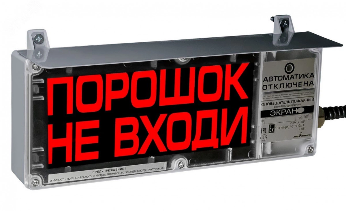Оповещатель ЭКРАН-СЗ предназначен для использования в качестве светозвукового средства оповещения, и обеспечивает подачу светового и (или) звукового сигналов в системах пожарной и охранной сигнализации, при совместной работе с любыми ПКУ. Оповещатель может использоваться для индикации режимов работы оборудования и привлечения внимания персонала в аварийных и иных ситуациях. Оповещатель взрывозащищенный ЭКРАН-С-К1-оповещатель с постоянно присоединенным кабелем в металлорукаве (по умолч),К1 - оповещатель без дополнительной секции.Текст надписи или содержание пиктограммы основной световой секции - по заказу.