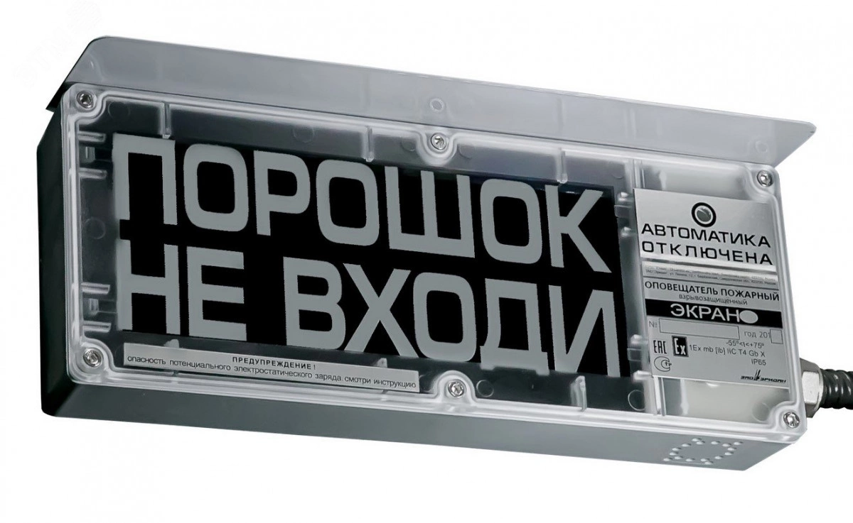 Оповещатель ЭКРАН-С предназначен для использования в качестве светового средства оповещения и обеспечивает подачу светового сигнала в системах пожарной и охранной сигнализации, при совместной работе с любыми ПКУ. Оповещатель может использоваться для индикации режимов работы оборудования и привлечения внимания персонала в аварийных и иных ситуациях. Оповещатель взрывозащищенный ЭКРАН-С-К1-оповещатель с постоянно присоединенным кабелем в металлорукаве (по умолч),К1 - оповещатель без дополнительной секции.Текст надписи или содержание пиктограммы основной световой секции - по заказу.