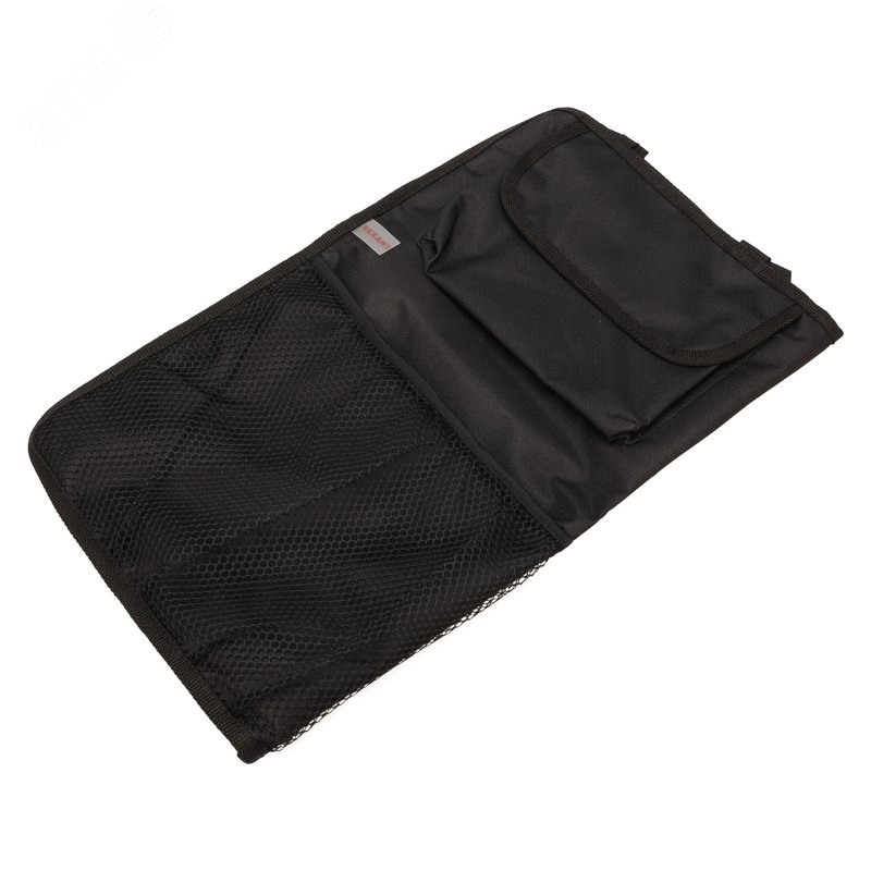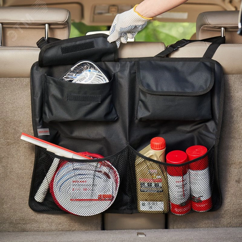 Органайзер на спинку заднего сиденья применяется для компактного размещения различных аксессуаров в багажнике автомобиля. Крепится за подголовники спинки заднего сиденья. Закрывает 2/3 площади спинки сиденья. Имеет 4 вместительных кармана.