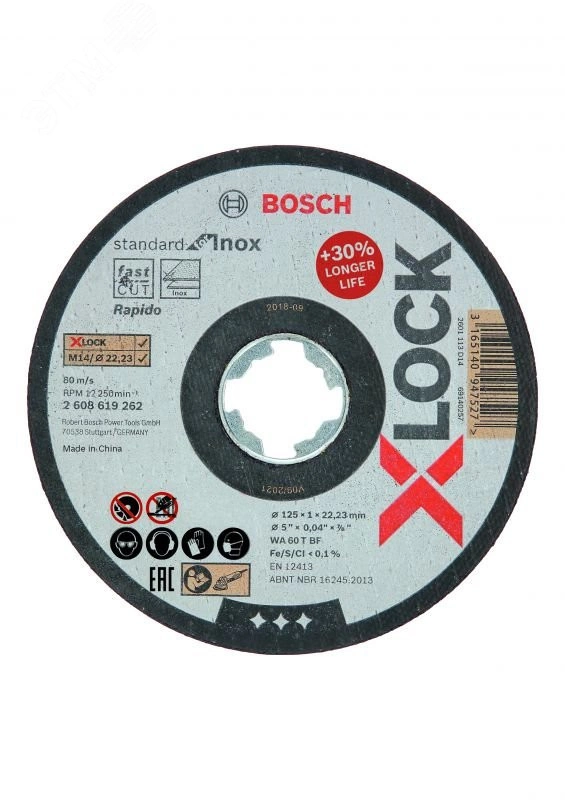 Отрезной диск X-LOCK Standard for Inox обеспечивает надежную работу по нержавеющей стали. Тонкий край диска позволяет осуществлять плавную и легкую резку. Кроме того, в диске отсутствуют железистые, сернистые и хлористые наполнители. Отрезные диски Bosch соответствуют самым высоким требованиям безопасности EN 12413. Диск используется для резки нержавеющей стали. Отрезные диски можно быстро и легко менять благодаря системе крепления X-LOCK без дополнительных инструментов. Отрезные диски X-LOCK также подходят к стандартным угловым шлифовальным машинам.