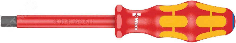 Отвёртка Wera VDE с многокомпонентной ручкой Kraftform для работы в быстром и щадящем режиме - твердые зоны ручки для высокой скорости работы, в то время как мягкие зоны ручки обеспечивают передачу больших моментов силы. Поштучная проверка в водяной бане под напряжением 10000 В для безопасной работы на оборудовании с максимально допустимым напряжением 1000 В. С маркировкой ручки для облегчённого отбора и сортировки инструментов. Шестигранный край ручки для защиты от перекатывания отвёртки на рабочем месте.