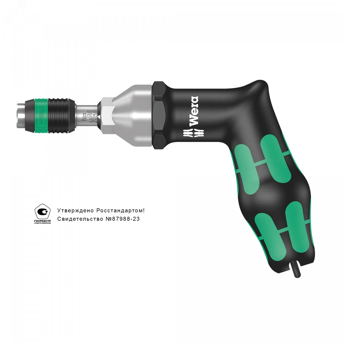 Динамометрическая отвёртка Wera. Ручка Kraftform пистолетной формы для передачи особенно больших моментов силы, многокомпонентное исполнение для высокой скорости работы и особенно эргономичного завинчивания. Установка значений момента силы с высокой точностью. Простая установка необходимого значения без специального инструмента. Хорошо читаемая шкала. Быстрозажимной патрон Rapidaptor для моментальной смены битов. Без ограничения момента силы при отвинчивании трудноподдающихся винтов. Многокомпонентная ручка Kraftform с твёрдыми и мягкими зонами для высокой скорости работы и для щадящего контакта с ладонью. Подходит для битов с шестигранным хвостовиком 1/4'' по стандарту DIN ISO 1173-C 6,3 и E 6,3 (ISO 1173). Инструмент сертифицирован. Сертификат № 87988-23 Ростест.