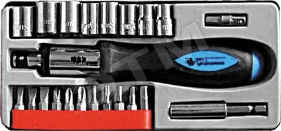 Магнитный фиксатор бит. Прорезиненная эргономичная ручка. В наборе - 11 бит из хром-ванадиевой стали (SL4, SL5, PH0, PH1, PH2, PH3, T15, T20, H3, Н4, Н5) + 8 головок (5.5, 6, 7, 8, 9, 10, 11, 12 мм) + адаптер для бит + адаптер для головок. Упаковка - пластиковый чемоданчик в блистере.