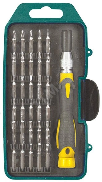 Для точных работ. В наборе - биты - 30 шт. SL1.5, SL2, SL2.5, SL3, PH000, PH00, PH0, PH1, PH2, T4, T5, T6, Torx с отверстием - Т7, T8, T9, T10, T15, T20, Н1.5, H2, H2.5, H3, H4, H4.5, Y-тип Y0, Y1, U-тип U3, Pentalobe P0.8, P1.5, P2. Материал - хром-ванадиевая сталь, пластиковая прорезиненная ручка. Упаковка - пластиковый футляр.