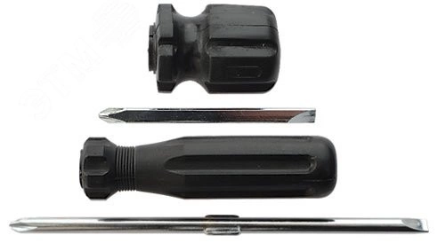С переставным жалом из хром-ванадиевой стали (плоское/крестовое), пластиковая ручка.