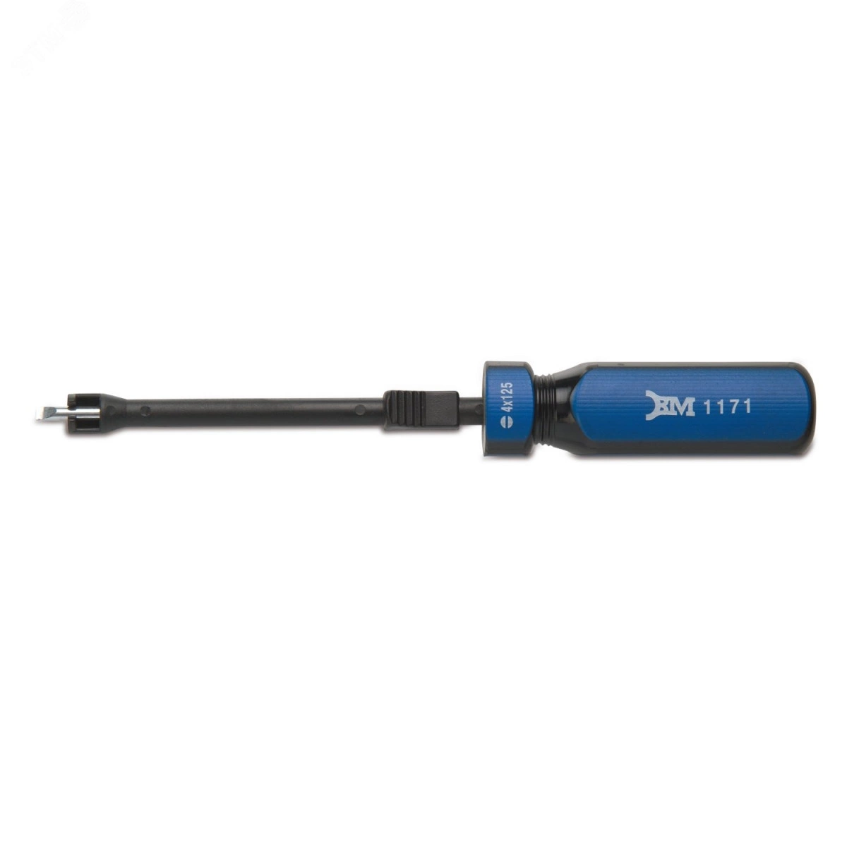 Отвёртка с устройством удержания винта, позволяет откручивать/закручивать крепёж в труднодоступных местах без риска выпадения винта. Размер шлица 4 мм, длина стержня 125 мм.