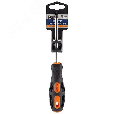 Крестообразный шлиц, 'плюс', крестовая, ' + '. Размер - наконечник (шлиц, плюс) PH1, 5.0 мм, лезвие (стержень, жало) 100 мм. Длина (общая) 195 мм. Двухкомпонентная рукоятка, магнитный наконечник. Материал лезвия - хром-ванадиевая сталь, материал рукоятки - пластик + термопластичная резина. Упаковка - пластиковый держатель. Подходит для крепежных деталей с диаметром наружной резьбы от от 2.1 до 3 мм.