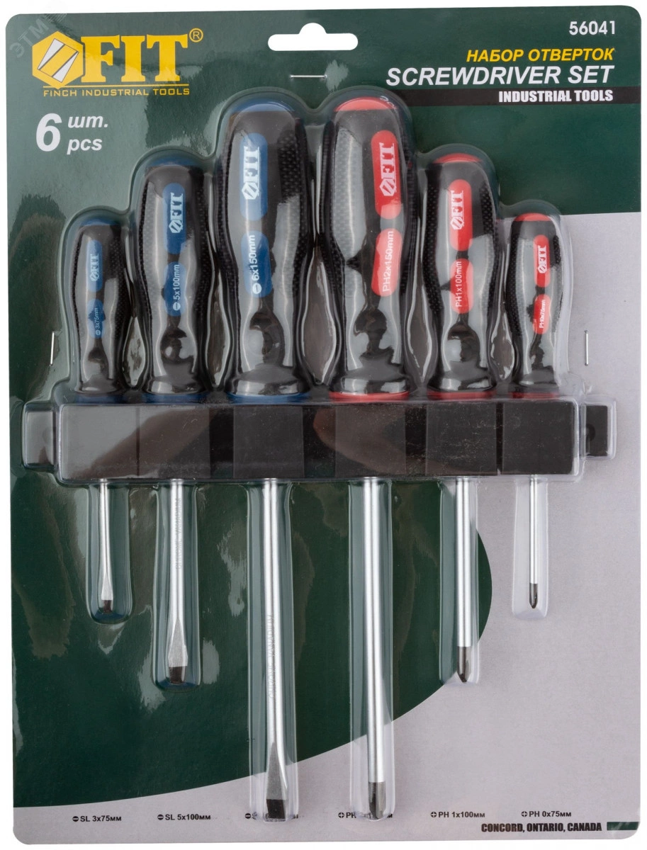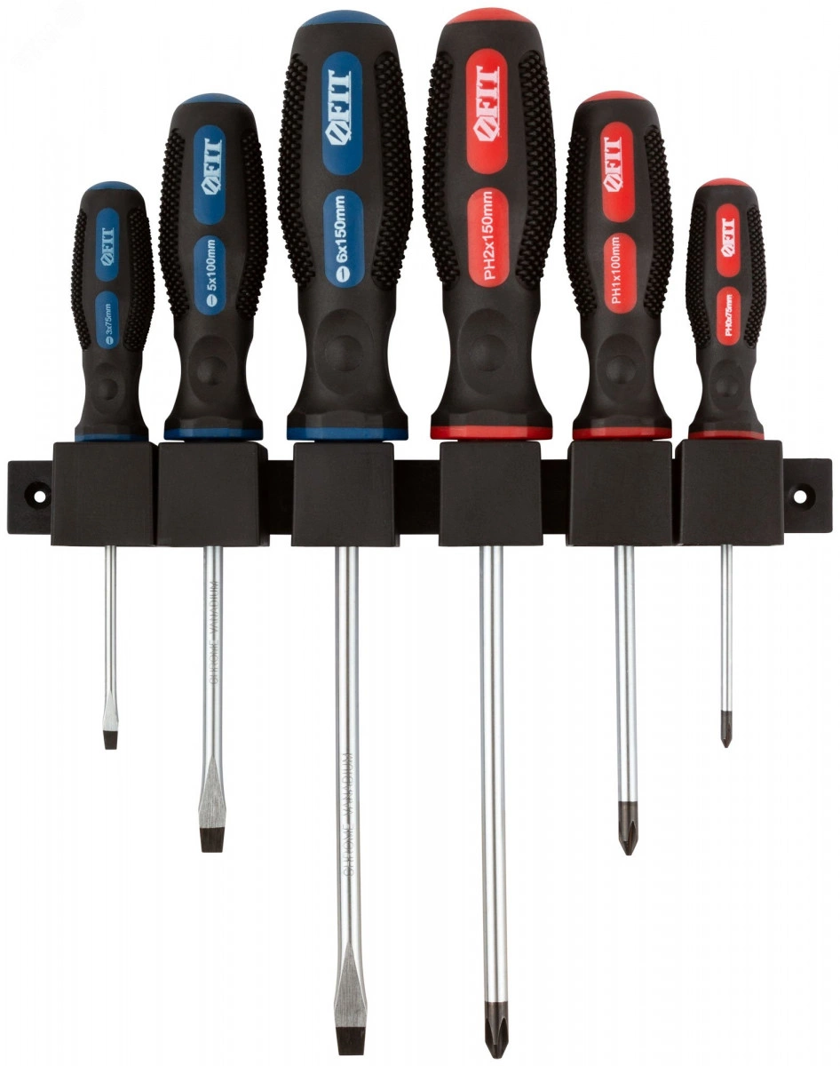 Набор 6 шт., в пластиковом держателе. Отвертки - SL3x75, SL5x100, SL6x150, PH0x75, PH1x100, PH2x150. Материал - жало из хром-ванадиевой стали, магнитный наконечник, мягкая прорезиненная ручка. Упаковка - блистер.