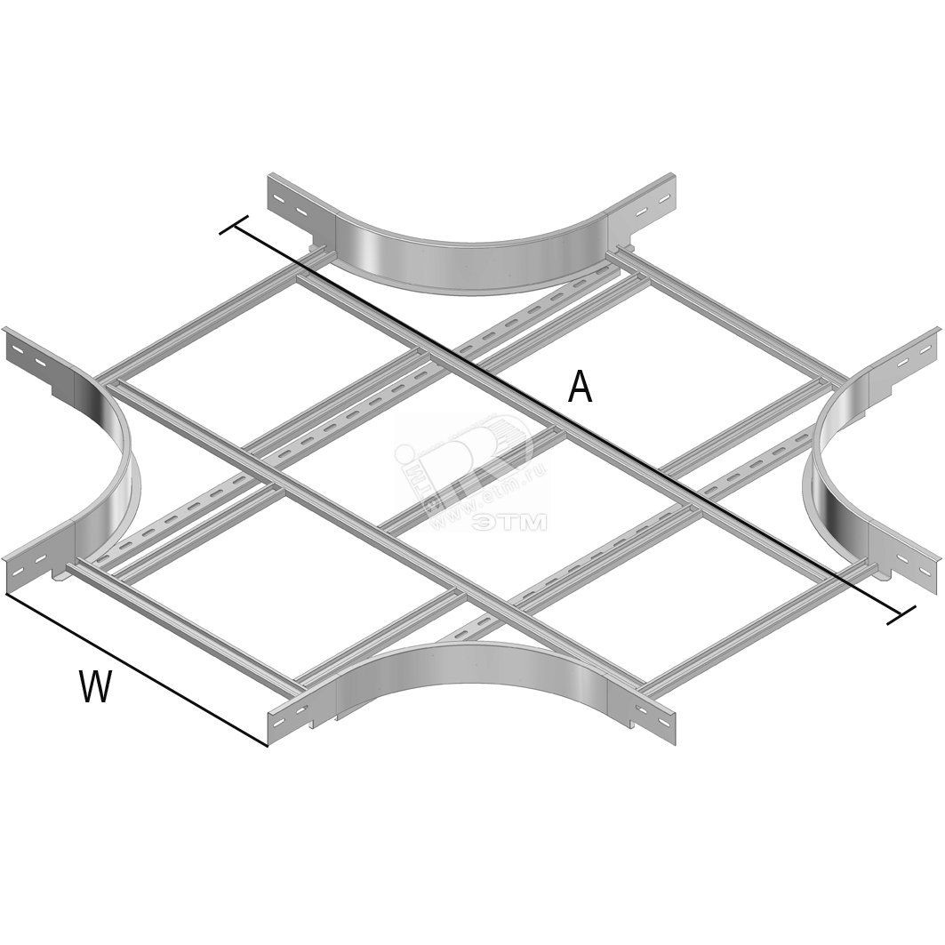 Ответвитель X-образный. Стандартное исполнение - сталь sendzimir. Варианты исполнения - HD - горячий цинк, PE -полиэфирное порошковое покрытие. Для лотков лестничного типа кабельных лотков лестничного типа с телескопическими концами. Предназначен для ответвления кабельной трассы. Монтируется с помощью комплекта гайка и винт VM6.10 от 16 штук.