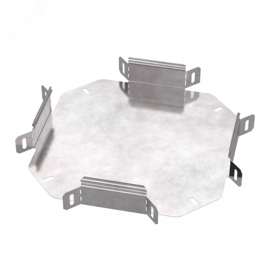 Аксессуары изготовленные из стали с защитным покрытием по методу Сендзимира – это изделия, на которых защитное цинковое покрытие было нанесено на листовую сталь перед изготовлением. Толщина защитного покрытия варьируется от 10 до 22мкм. Климатическое исполнение изделий УХЛ2, что предусматривают эксплуатацию в помещении и под навесом, при температуре эксплуатации от -80 до +150°С. Ответвитель X-образный предназначен для разветвления кабельных трасс в горизонтальном направлении, для перфорированных и глухих лотков. В комплект не входит крышка.