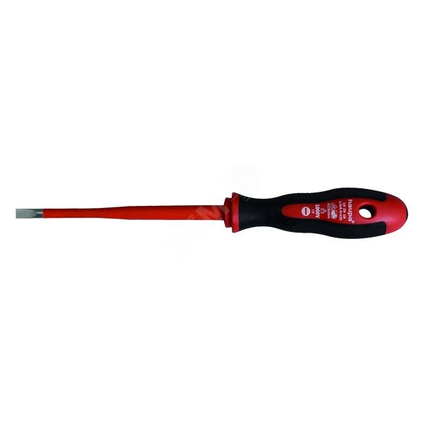 Диэлектрическая отвертка для выполнения электромонтажных работ под напряжением до 1000 В, двухкомпонентная рукоятка из полипропилена/термоэластопласта, стержень из молибден - ванадиевой стали с уменьшенным диаметром и интегрированной защитной изоляцией, позволяет добраться до глубоко расположенных винтов. Длина стержня 125 мм.
