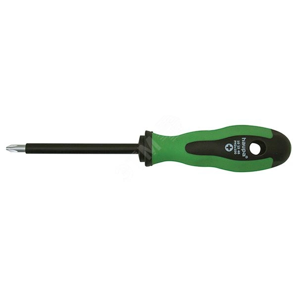 Крестообразная отвертка с двухкомпонентной рукояткой из полипропилена/термоэластопласта, стержень из молибден - ванадиевой стали защищен покрытием из ПВХ, длина стержня 100 мм.