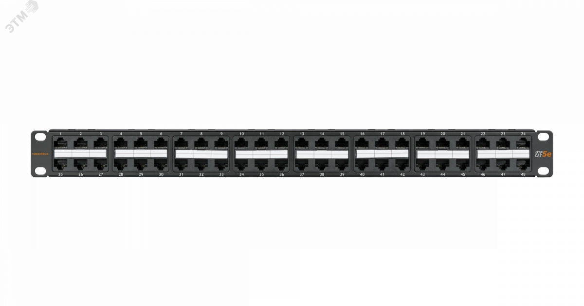 Коммутационные панели (патч-панели) предназначены для монтажа кабелей в различных подсистемах СКС и подключения отдельных составляющих сети друг к другу при помощи коммутационных шнуров. Неэкранированные патч-панели выполнены в черном цвете и предназначены для монтажа в 19' шкаф или стойку. Панели NMC-RP48UD2-2U-BK (кат.5е) при высоте в 2U и вмещает 48 портов RJ45/8P8C. С тыльной стороны патч-панелей размещены контакты 110 типа с цветной маркировкой по двум стандартам - T568 А и B. Особый дизайн контактов также позволяет использовать для заделки кабелей ножи типа KRONE. Для удобства администрирования все порты пронумерованы, а также имеются дополнительные площадки для маркировки. В комплекты патч-панелей входят удобные съемные органайзеры для разводки входящих кабелей.
