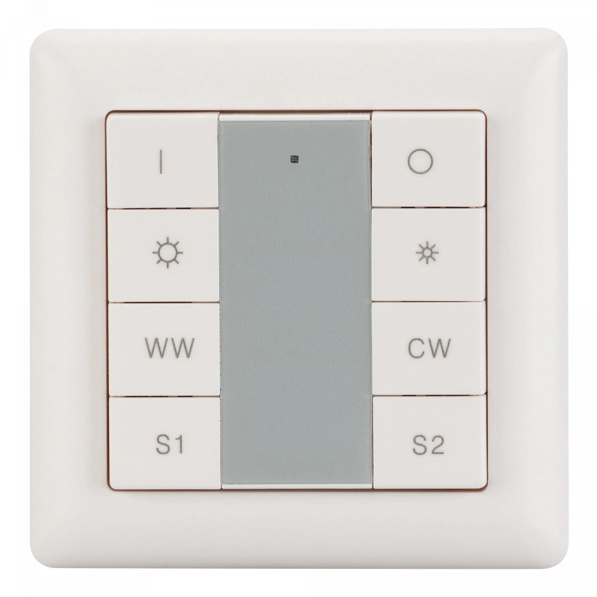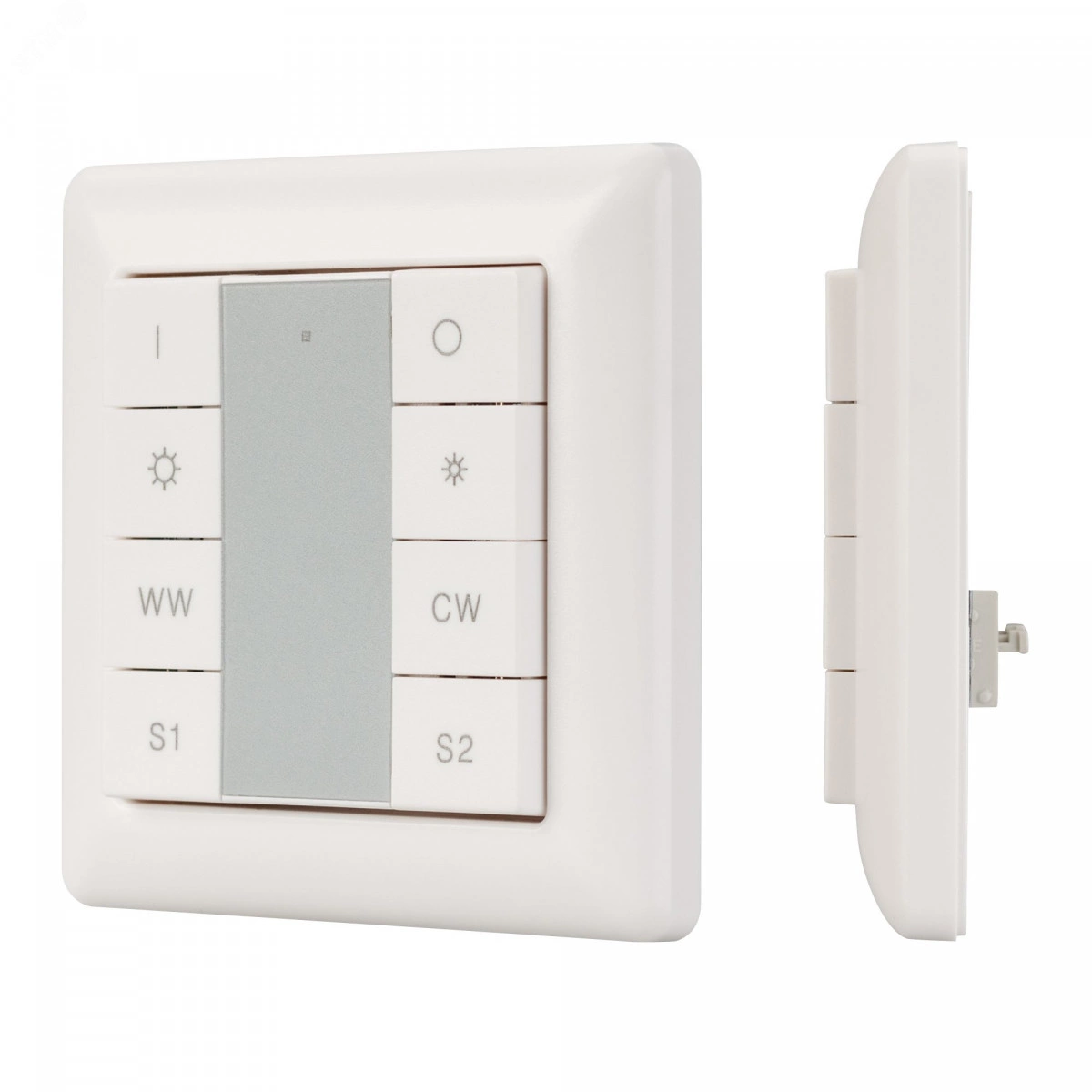Встраиваемая кнопочная белая пластиковая панель для работы по протоколу DALI. Включение/выключение, диммирование и управления цветом свечения (MIX, CCT, HCL) 1 группы. Вызов и сохранение 2-х сцен. Поддержка команд DT8, при адресации 2 каналов (CWплюсWW) на 1 адрес. Возможно широковещательное управление. Установка номера группы и номера первой сцены выполняется переключателями на корпусе. Питание от шины DALI (4 мА).