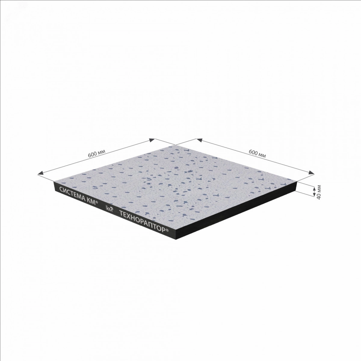 Панель фальшпола представляет собой плиту из влагостойкого ДСП без применения вредных веществ с финишным покрытием из антистатического ПВХ. С торцов панель закрыта ПВХ кромкой, снизу - стальной оцинкованной пластиной. Высота панели 40 мм, ширина 600 мм и длина 600 мм. Применяется в составе системы промышленных полов TECHNORAPTOR®. Такой фальшпол обеспечивает быстрый и удобный доступ к внутренним коммуникациям.
