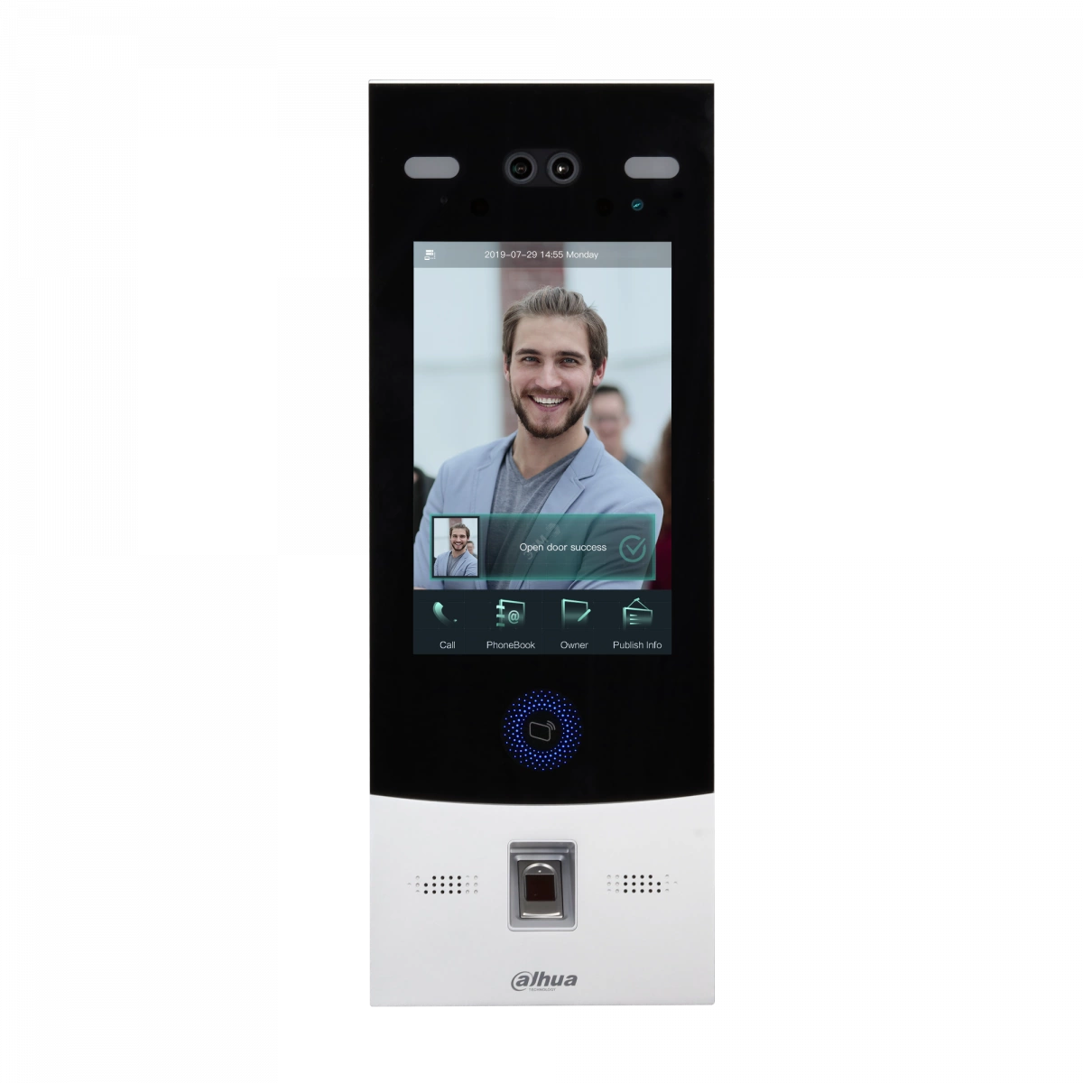 Вызывная панель с разрешением камеры 2мп и CMOS сенсором, емкостный сенсорный IPS экран с диагональю 8 дюймов и разрешением 800х1280, алюминевый корпус,открытие по отпечатку пальца, карте, сканированию лица паролю или Bluetooth ключу. Количество лиц в памяти 20000, время распознавания лица 0.2 сек, IK07.