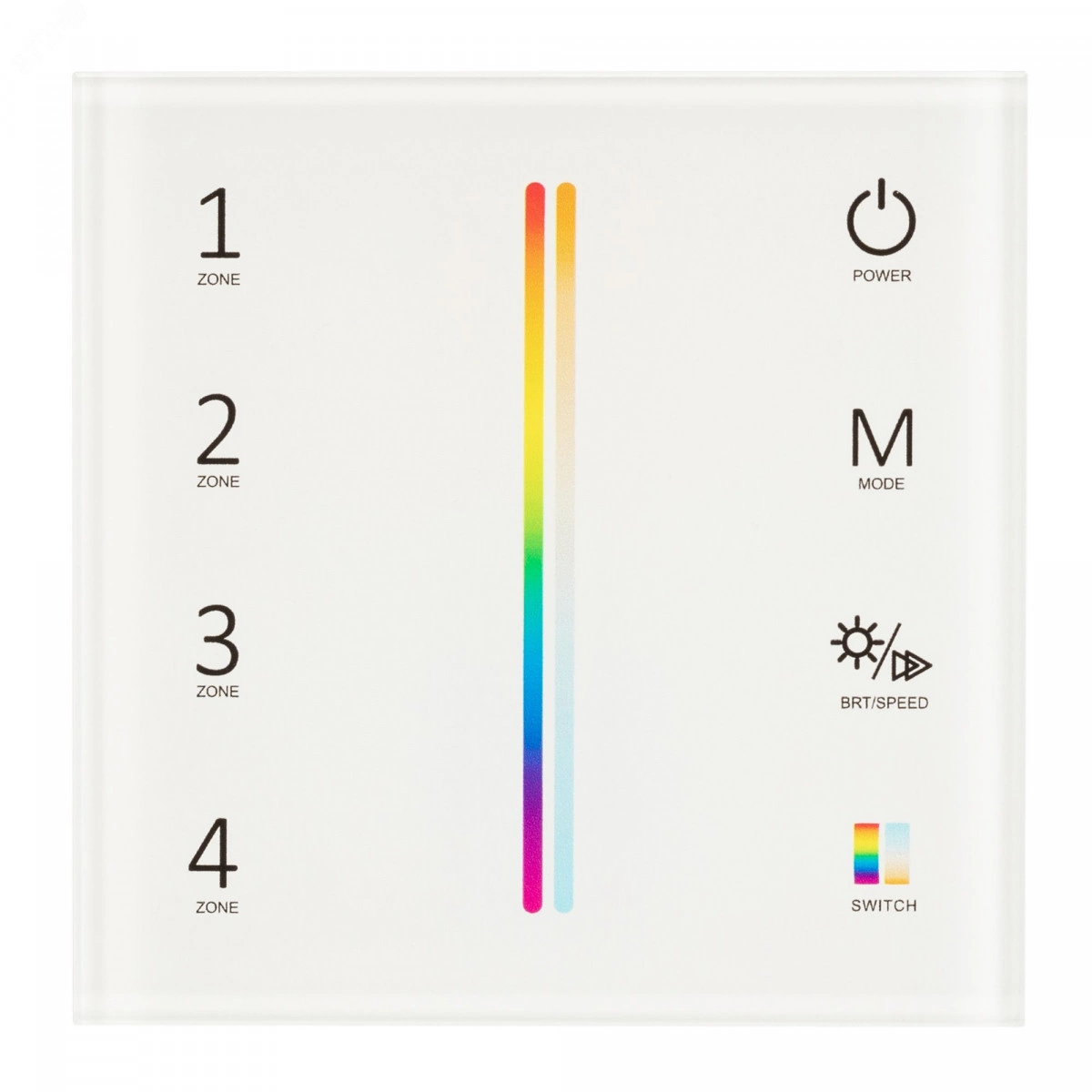 Накладная сенсорная панель 2.4 ГГц, цвет белый. Материал - стекло. Для управления RGBплюсMIX (5-канальными) источниками света (ШИМ), 4 зоны управления. Питание/рабочее напряжение 3VDC от 2xAAA. Габариты 86х86х21 мм. Панель совместима с контроллерами серии SMART.