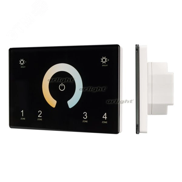 Встраиваемая сенсорная панель 2.4 ГГц, цвет чёрный. Итальянский стандарт. Материал - стекло. Для управления мультибелыми (MIX/CCT) источниками света (ШИМ), 4 зоны управления. Функция управления DMX512 устройствами. Питание/рабочее напряжение AC 85-265V. Габариты 120х80х37 мм, устанавливается в стандартный подрозетник. Панель совместима с контроллерами серии SMART.