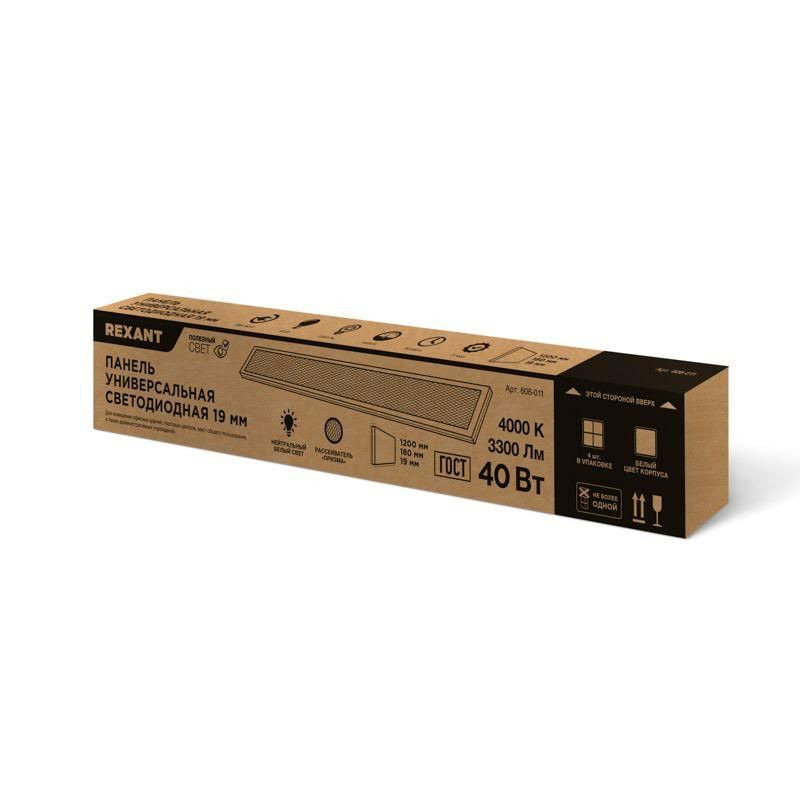 Панель светодиодная 19х1200х180 40Вт 180–260В IP20 3300лм 4000К нейтр. бел. универс. призма Rexant 606-011
