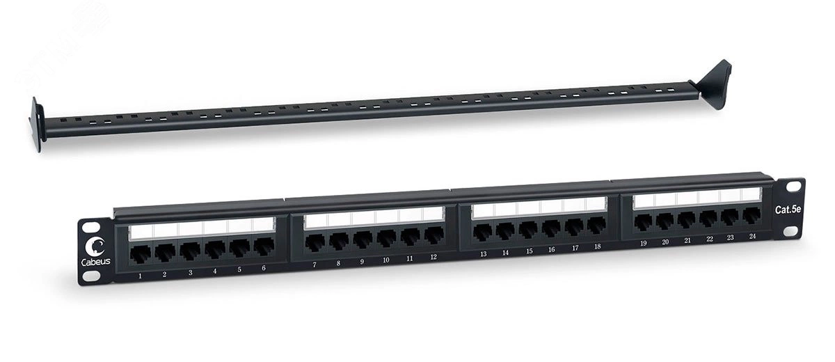 Коммутационные панели (патч-панели) предназначены для терминирования на них кабелей различных подсистем СКС и для коммутации отдельных элементов сети друг с другом при помощи коммутационных шнуров. Неэкранированная патч-панель Cabeus выполнена в 19 дюймовом формате и предназначена для установки в телекоммуникационные шкафы и стойки. формате и предназначена для установки в телекоммуникационные шкафы и стойки. Соответствует характеристикам категории 5е. Имеет 24 порта RJ-45. С лицевой стороны все порты пронумерованы. С тыльной стороны патч-панели размещены контакты типа Dual IDC с цветной маркировкой по двум стандартам - T568 А и B. Ножи контактов располагаются под 45 градусов, что лучше сказывается на передаточных характеристиках разъема. Для заделки проводников подходят ножи тип 110 и Krone. Патч-панель имеет встроенные задние организаторы для фиксации кабелей.