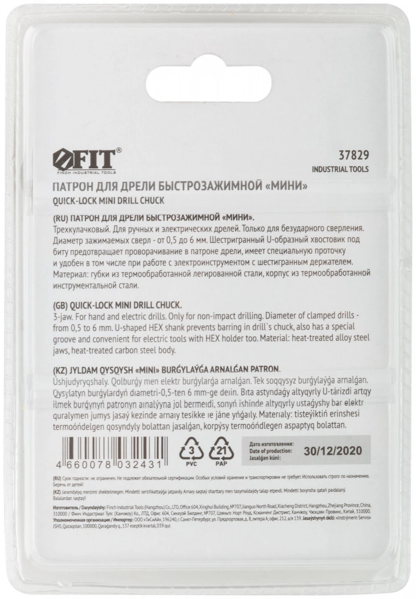 Патрон быстрозажимной трехкулачковый Мини FIT IT с шестигранным U-образным хвостовиком под биту используется с ручными и электрическими дрелями в режиме безударного сверления. Предназначен для зажима оснастки. Корпус патрона выполнен из инструментальной стали, губки - из легированной стали, что обеспечивают долговечность изделия.