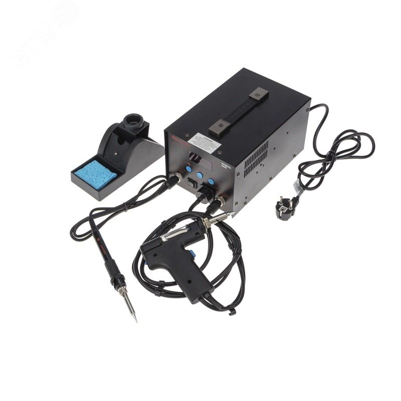 Многофункциональная паяльная станция 2 в 1 применяется для демонтажа или пайки различных видов электронных компонентов. Используется для ремонта портативной электроники, бытовой техники, а также для сборочных операций в небольшом производстве. Станция оснащена классическим паяльником и демонтажным паяльником. Оба устройства автономны и могут работать независимо друг от друга. Микрокомпьютер для цифрового отображения данных и контроля температуры с точностью до 1 градусовC, большая мощность, быстрый разогрев. Все эти преимущества делают бессвинцовую распайку или пайку безопасной для таких чувствительных компонентов как SOIC, PLCC, QFP, BGA и т. д. В комплектацию станции входят- основной блок, паяльник, демонтажный паяльник, держатель паяльника, губка для очистки жала паяльника (в ложементе).