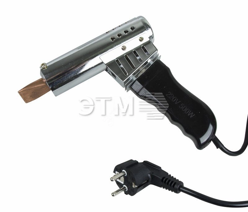 Электрический паяльник ПП 500 Вт с пластиковой ручкой, выполненной в виде пистолета, непрерывного нагрева предназначен для монтажной пайки и лужения оловянно-свинцовистыми припоями крупных деталей, в том числе автомобильных кузовных деталей и радиаторов в производственных и бытовых условиях. Конструкция данного паяльника делает работу с ним удобной и комфортной. Перед началом эксплуатации электрического паяльника паяльное жало следует подвергнуть лужению. Напряжение питания - 230 В. Мощность в установившемся режиме - 500 Вт. Рабочая температура паяльного стержня - 400 градусов. Диаметр жала паяльника - 20.5 мм. Время разогрева до рабочей температуры 5-15 минут. Длина провода - 1.5 метра.