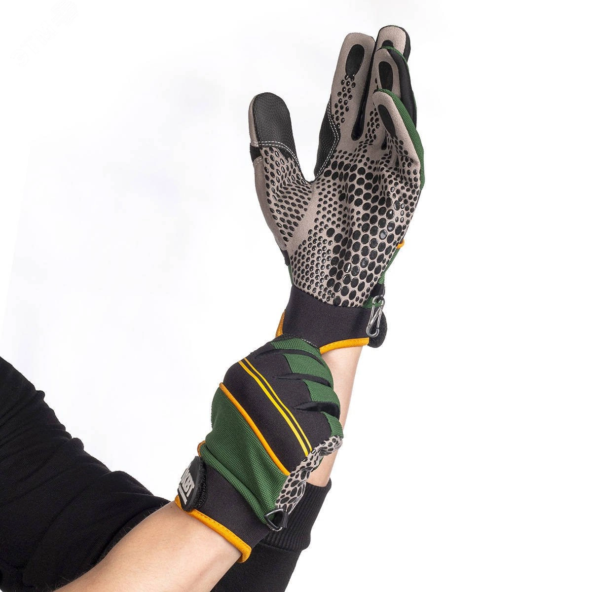Перчатки с нескользящим силиконовым покрытием. Поставляются двух размеров - M (8) и L (9). Состав - 35% искусственная кожа, 30% спандекс, 15% неопрен, 15% силикон, 5% полиуретан, ладонная часть изготовлена из прочной синтетической кожи с силиконовыми точечными элементами, обеспечивающими повышенное сцепление перчатки с предметами, предотвращая их выскальзывание. Мягкие вставки на тыльной стороне защищают руку от ударов. Специальный материал на тыльной стороне и пальцах обеспечивает вентиляцию руки. Эластичная застежка на липучке обеспечивает удобную подгонку и надежную фиксацию перчатки на руке